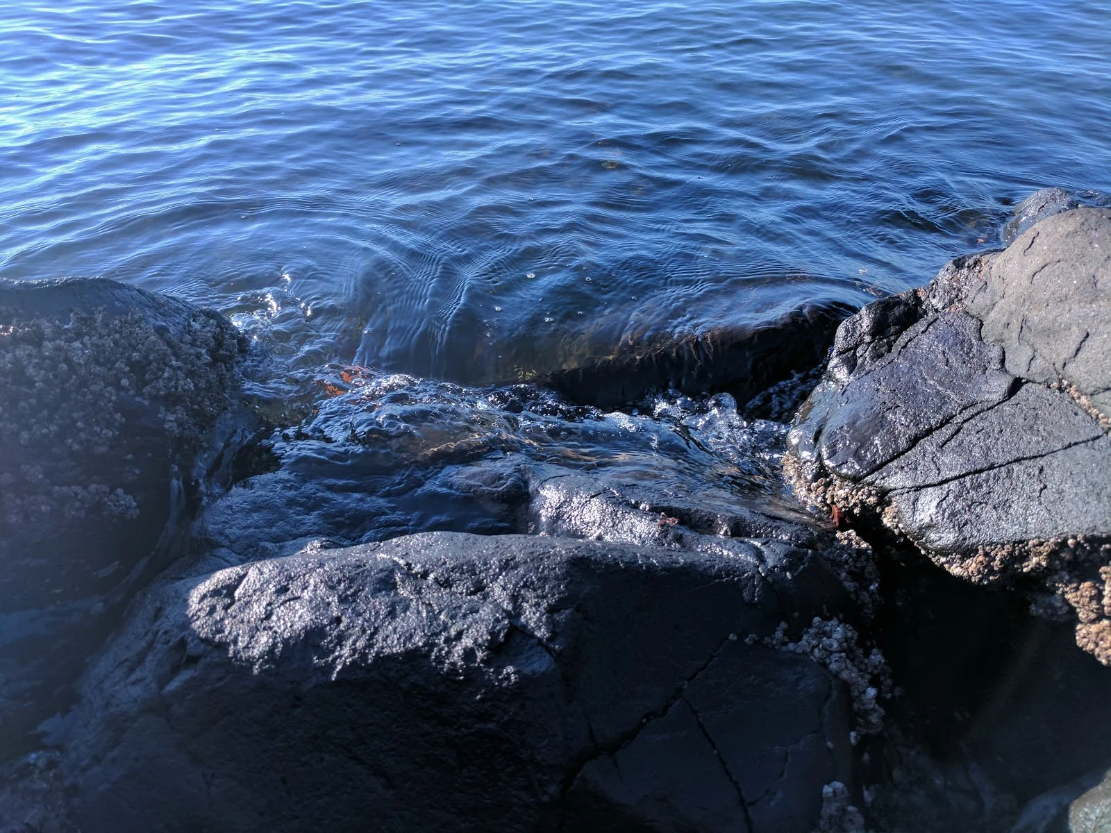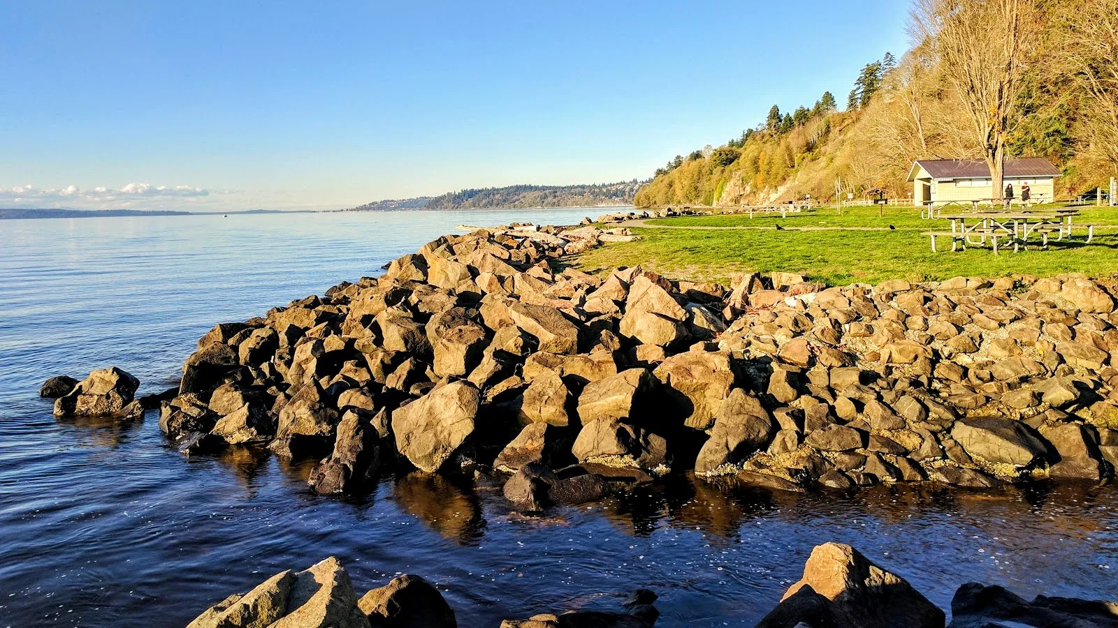 A bit of sandy shoreline provides a beach for combing or simply luxuriating in the sun warmed sand. Water gently lapping forward and back again, a mantra of relaxation for the weary. A well maintained asphalt path leads along the waterfront, now fortified by large rocks as you move away from the sand. Looking out over the water several, small, rock islands breach the surface and provide stages for birds to display themselves in the sun. Boats pass by causing tiny tsunamis upon the rocks, only just interrupting the peacefulness.