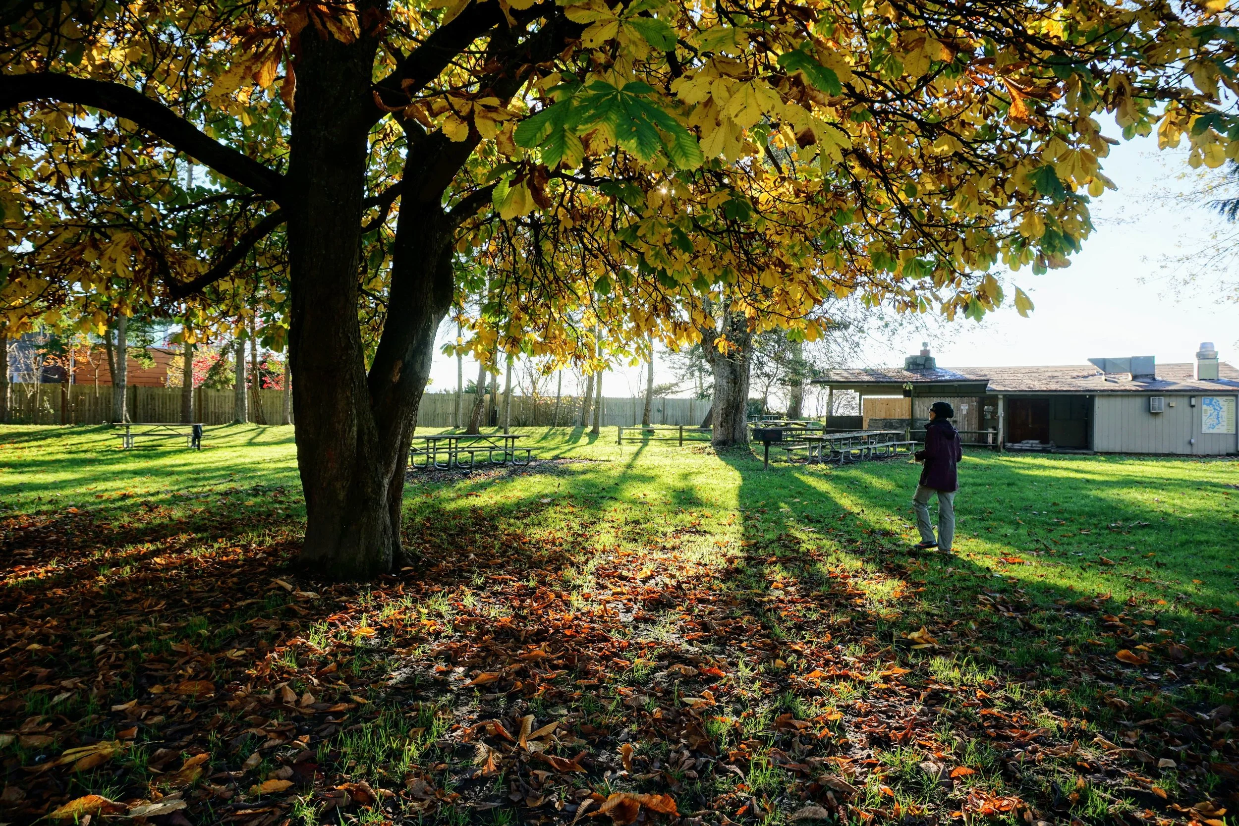 Parks, for us are oases in the desert of life's busyness. Like an oasis, providing an escape from the hardships of routine, a refreshing gulp of nature that leaves us hydrated long after leaving, a necessity to be returned to. We visited Saltwater State Park in the sunny brilliance of a Fall afternoon. The chestnut trees, having given up their burdens, bore a sparseness of yellowing leaves. The evidence of their once substantial canopies now lay underfoot in the form of yellow to brown leaves and partially gnawed chestnuts. Squirrels hopped through the grasses of the picnic area, carrying out their preparations for cooler weather to come, but for today, it was still Fall.