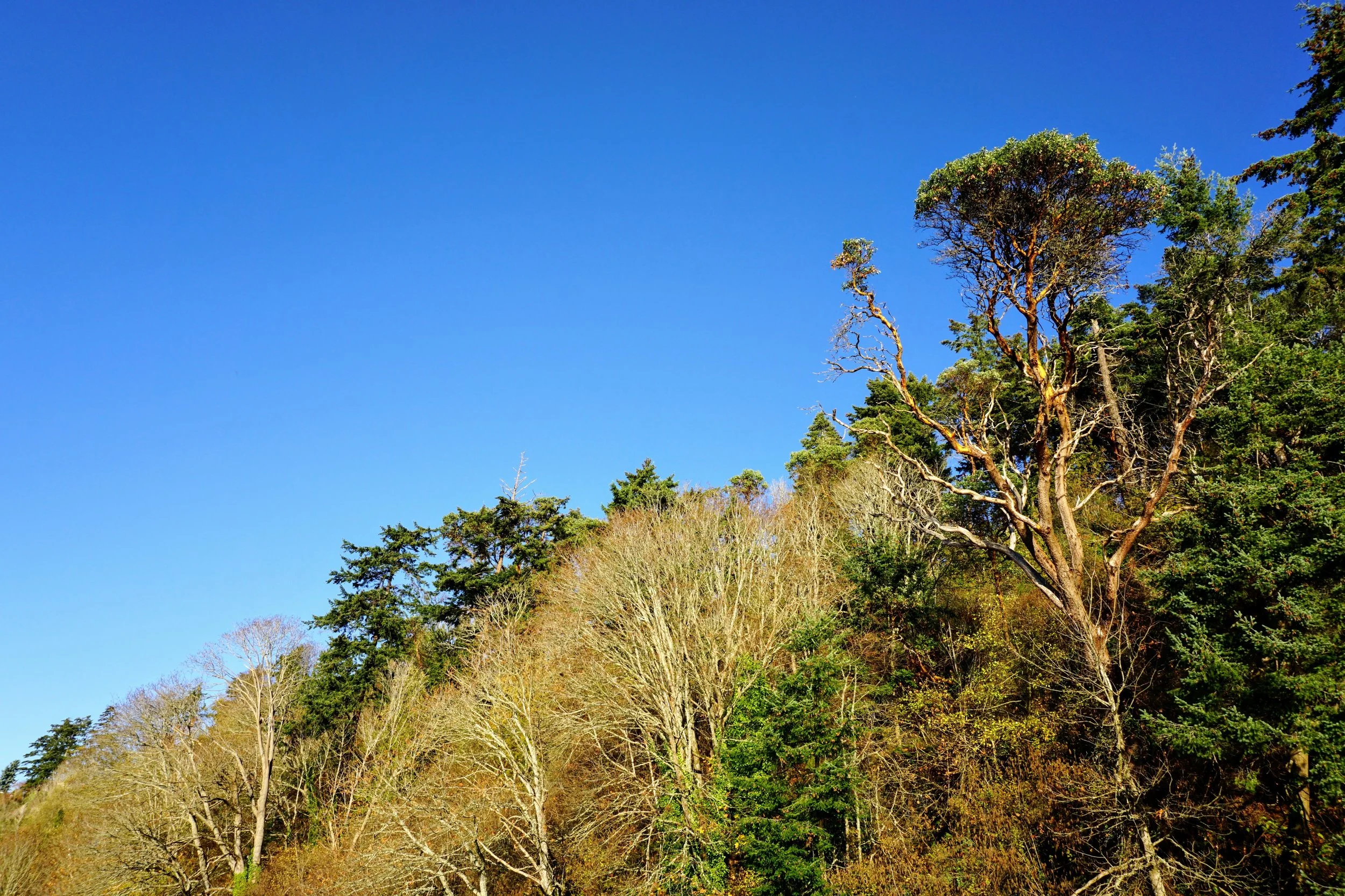 A hillside is the bookend of the other side of the path. Steep and tree filled, the striking red bark of Medronas are easily picked out among the others. Turning back on the path, toward the parking lot, more paths are to be found. Leading into the forest, it was just too lovely a day to hide in the shelter of the trees. We'll venture down those paths another day. While the campsites are closed for the season, we're told they are excellent. Perched high, with great views, we'll certainly have to find out for ourselves when the season returns.